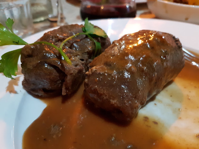 For my entree, I had the Bragioli (€13), a Maltese dish very similar to my family's recipe but in a brown wine sauce instead of marinara, coming with wonderful roasted potatoes and salad. The two large bragioli consisted of thinly sliced beef rolled around homemade Maltese sausage and topped with the delcious sauce.